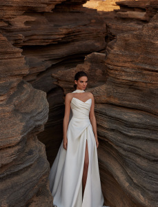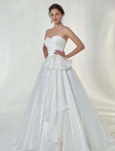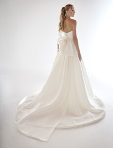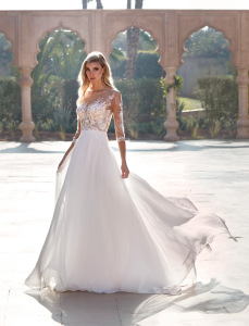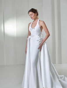 Il bianco resta il grande protagonista, simbolo di purezza e tradizione, mentre il pizzo si unisce con egregia maestria a tessuti pregiati come tullè, chiffon, seta mikado per un armonia di veli che dà vita ad abiti o set unici nel loro genere.